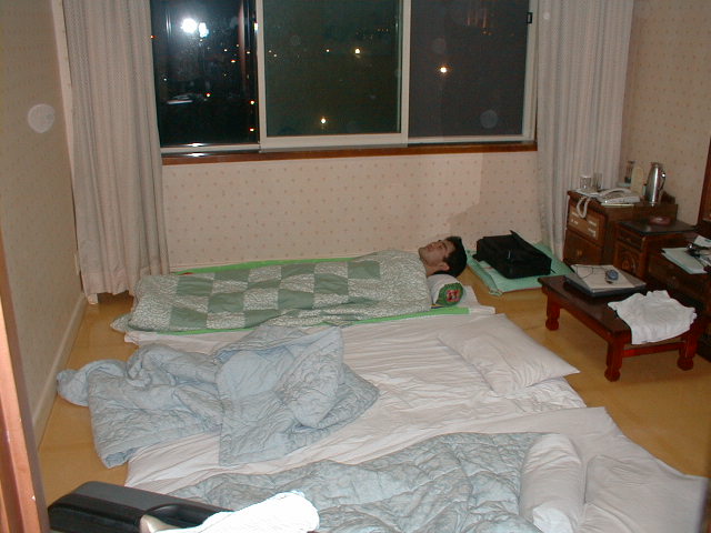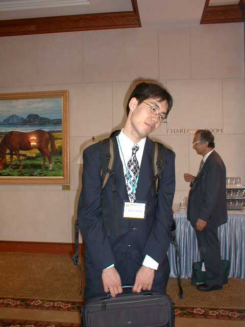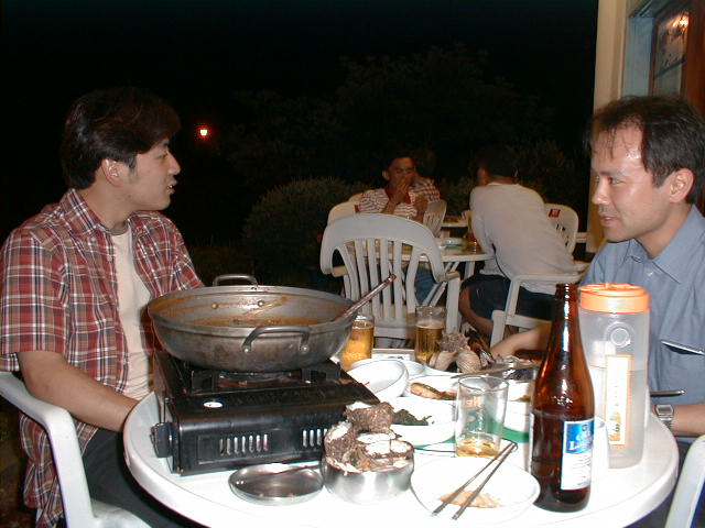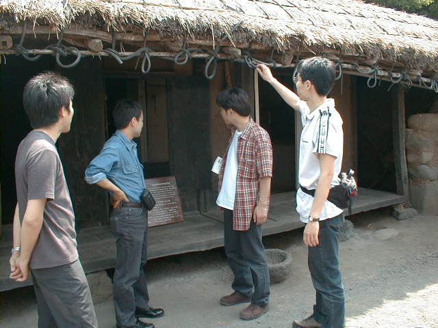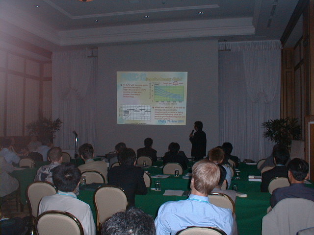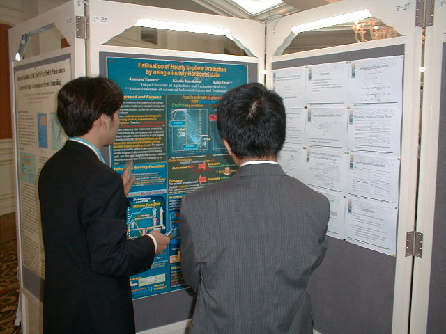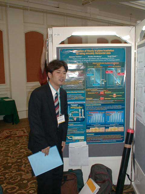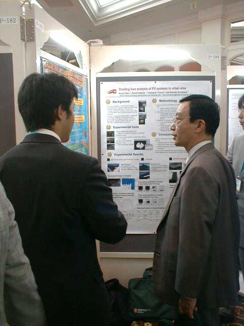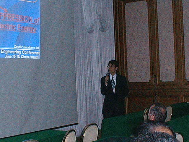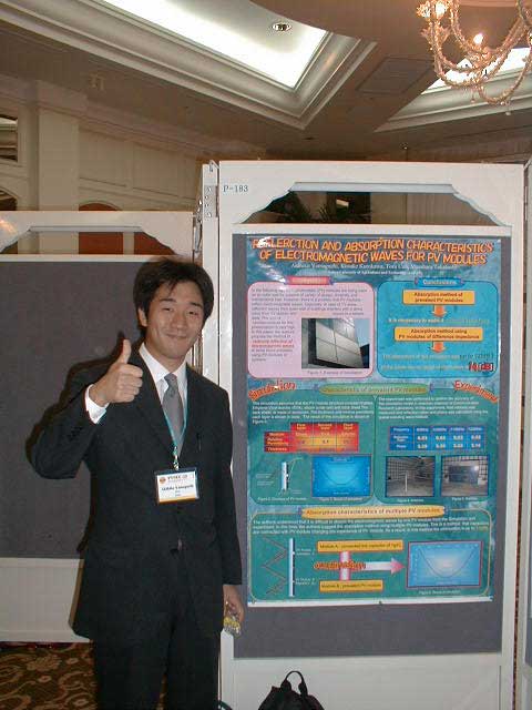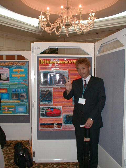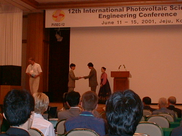今年のPVSEC-12thは韓国(済洲島)で開催という近さもあり、K教授と今年から入られた助手のK先生、 そして学生5人のT、O、I、Y、Iという大人数で乗り込みました。PVSEC-12thの最初の2日間はIEAのPVPSのうちの、タスク[の専門家会議が行われ、沙漠に太陽光発電システムを設置するための話し合いが行われました。学生も2人オブザーバーとして参加し、貴重な体験をしてきました。もちろん終わった後は日本人組で打ち上げ。学生は何もしていないんですが、とりあえず参加。ここでIはうかれているが、のちに大変なことに。今回の学生達の宿泊場所はPVSEC-12thの開催場所であるロッテホテルのすぐ隣にあるハナホテル。隣の非常に豪華なロッテホテルを見ながらの宿泊はやや悲しい物があります。最初に宿泊した部屋は韓国の伝統であるオンドル部屋(その2)。床暖房が入っており、冬はとても快適だそうです。しかし、今は夏前の梅雨の時期。当然床暖房の良さは実感できませんでした。こちらではとても薄いタオルケットのような敷き布団で寝ます。普段柔らかい布団で寝ている日本人としてはやや辛い。後で別のベッドの部屋に移してもらいました。 PVSEC-12thの初日は午後からオープニング。午前中は済洲島を見て回りました。中には物を壊しちゃった人も。午後はタスク[のシンポジウム。先日の会議の内容を含め、講演が行われました。夜はロッテホテルにてレセプションが行われ、みな思い思いの食べ物を食べました。その頃ロッテホテルの中にはショーが行われ、B級映画さながらの迫力にみなさ ん喜んでいました。12日はTのポスタープレゼンテーションとIのオーラルプレゼンテーション。田村の発表は無難に終わったが、Iの発表の時はそのセッションに来ない人が多く、7番目だったはずなのに発表した順番は3番目。どういうことだ??写真は終わってホッとしているところ。夕方は近くの韓国料理屋(その2)へ。そこには子犬のアーチが。Oは喜びすぎ。さらにその後、ホテルで2次会の始まり。おいおい、また呑むのかよ。 13日はIと卒業生Mさんのオーラルプレゼンテーション。二人とも教授に修正を入れられ、落ち込んでいました。その夜は当然お酒。ロッテホテルに泊まっていたMさんの部屋へ行き2次会。Iはやけ酒を飲んでいました。(冗談)(酔っぱらい) 14日はやっとOと山口のポスタープレゼンテーション。二人とも日本語で、時 には英語で説明をしていました。感想は?・・・足が疲れた〜。夜はバンケット。最初は韓国の民族舞踊や音楽で不思議な気持ちがありました。しかし、なかなか食べられないご飯。学生には辛い・・・。15日は閉会式。優秀な論文を書いた人、優秀なポスターを書いた人が表彰されました。黒川研からは・・・残念ながら一人も出ませんでした。次回に期待! 閉会式も終わり、やっと大変だったPVSEC-12thも終了。記念写真を撮って日本へ帰郷です。みんなうきうきで済洲島を後にします。なんでかって、これから韓国を観光だからです。