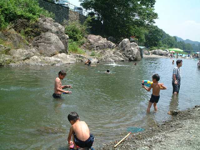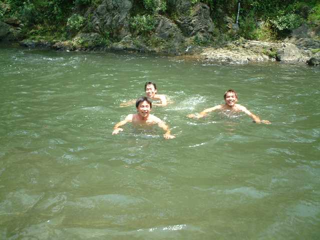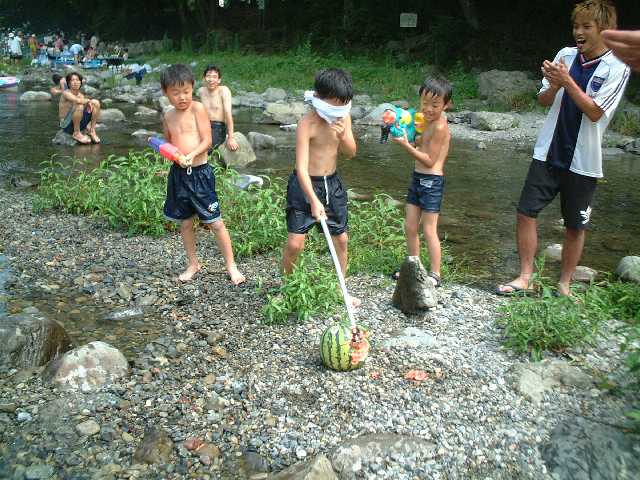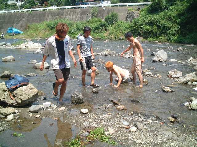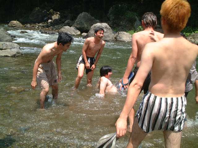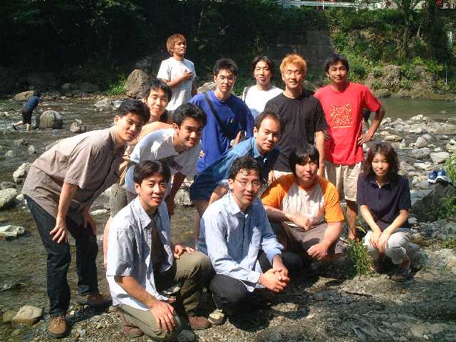 七月に入り連日うだるような暑さが続く中、Kさんの命を受けた宴会部長Y氏の取り仕切りによる黒川研恒例?のバーベキュー大会が秋川渓谷にて行われました。助手のKさんをはじめOB、研究室メンバー含めて総勢13名が参加しました。現地には車組と電車組に分かれて向かいましたが、車組は早くに到着し電車組がたどりついたころには、もうすでに数名が出来上がっておりました。。。 さすがに川辺の木陰は涼しく、快適です。にぎやかにバーベキューを済ました後は、皆、川に飛び込んだり、まわりの子どもと戯れたり、思い思いに休日の午後を満喫しました。![]() そして、ついに(これも恒例の?)忍び寄る魔の手が・・・服が乾いても放り込まれ、はっきり言って悪循環です!! なんだかんだと言いつつ楽しい時間は過ぎ、Kさん差し入れのスイカでスイカ割り大会。しかし、情けない大学生たちは割ることができず、結局子どもたちに割られる始末。まぁでも、おいしく頂きました。 恒例夏のバーベキューは、こうして成功のうちに幕を閉じました。是非また来年もやりたいものです。